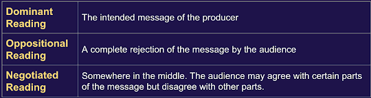 It talks about how gender, age, income and culture, etc changes how the audience interprets a text / character. Every audience will have a different reading and it could be from the 3 bellow.